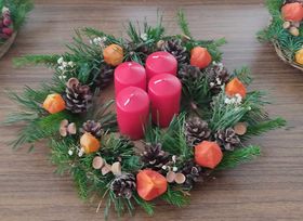 Pinti vainiko atėjusios moterys ant kartoninio pagrindo komponavo eglių ir  pušų šakeles, kankorėžius, o sudėjusios klijavo karštais klijais. Laikas praėjo lyg akimirka, rezultatas – puikūs Advento vainikai.