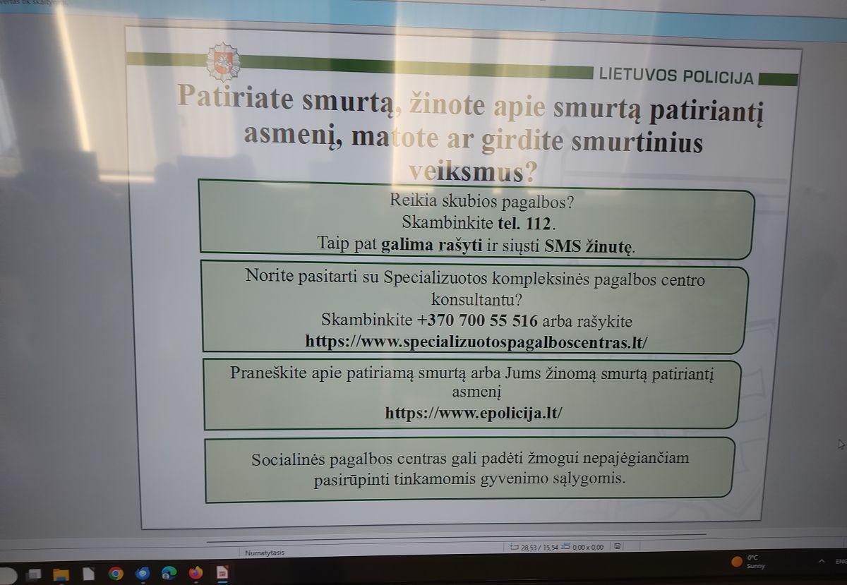 Smurto tema yra jautri, tačiau apie ją būtina kalbėti. Ignalinos rajono policijos komisariato Veiklos skyriaus tyrėjos Jurgita Zenkuvienė ir Nadežda Larionova, pristatydamos smurto problematiką, teigė, kad Utenos apskrityje smurtas artimoje aplinkoje yra viena opiausių problemų. Smurtas gali būti ne tik fizinis, bet ir psichologinis, ekonominis bei seksualinis. Dažnai psichologinį smurtą vėliau pakeičia fizinis smurtas.