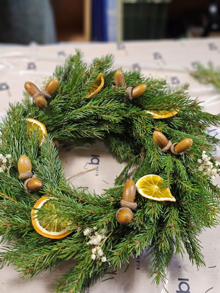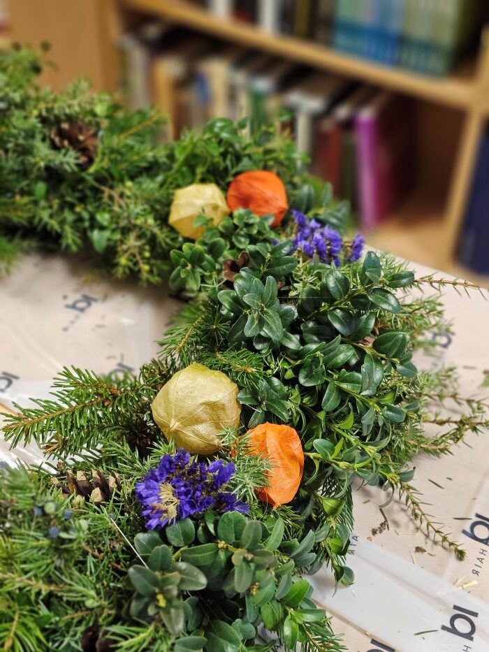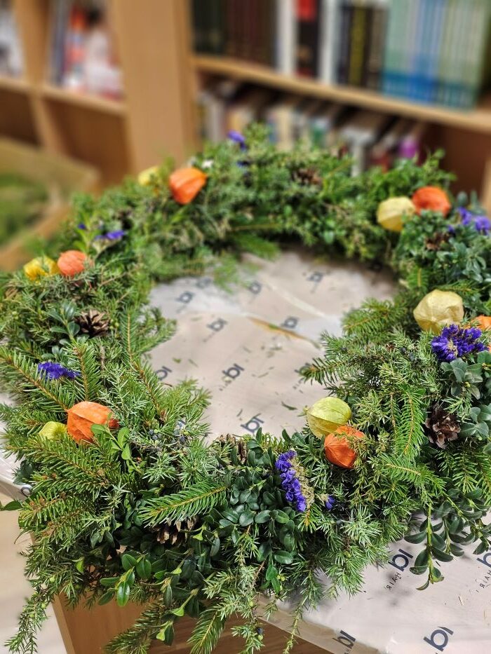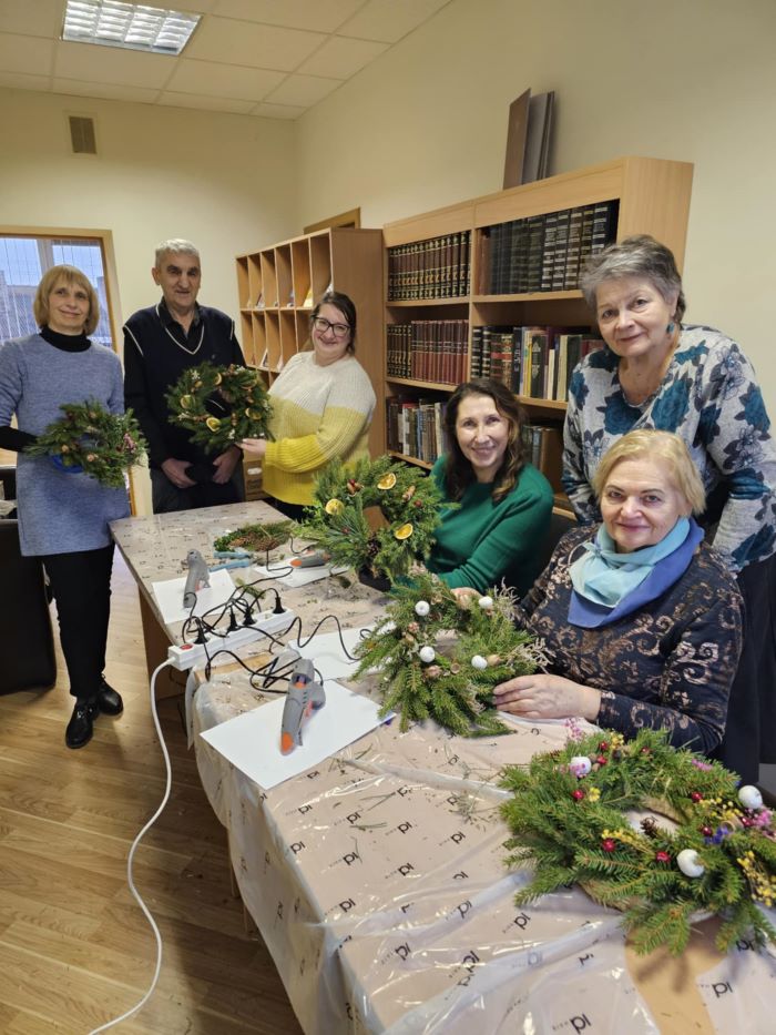 Gruodžio 3 dienos popietę jaukioje bibliotekos aplinkoje vyko edukacija „Advento vainiko pynimas“. Edukacinį užsiėmimą vedė Renata Veličkienė. Pasiruošę reikiamas medžiagas, dalyviai nėrė į kūrybinį procesą – pynė vainikus iš eglės, pušies ir kitų spygliuočių šakelių.