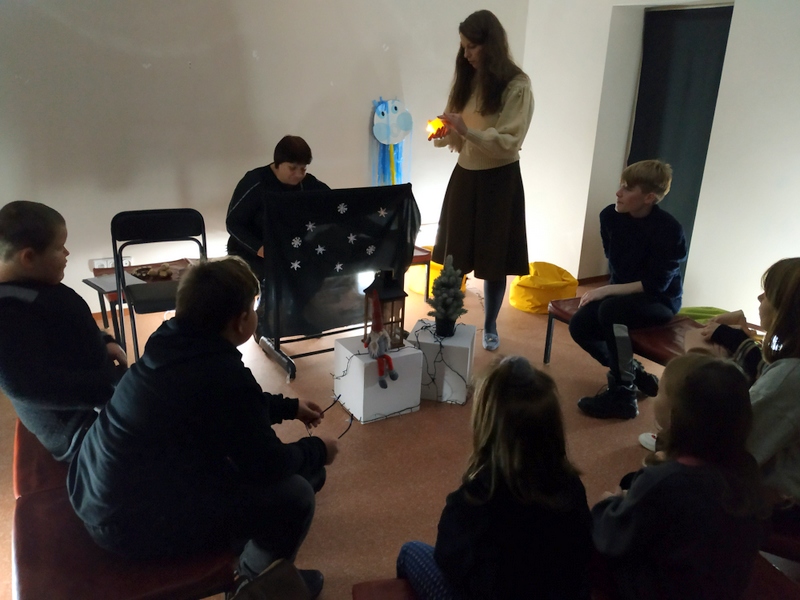 Bibliotekoje lankėsi, bei Mįsliuko lėlių teatro muzikinės pasakos apie žibintą klausėsi, dienos centro „Eldoradas“ vaikai.
