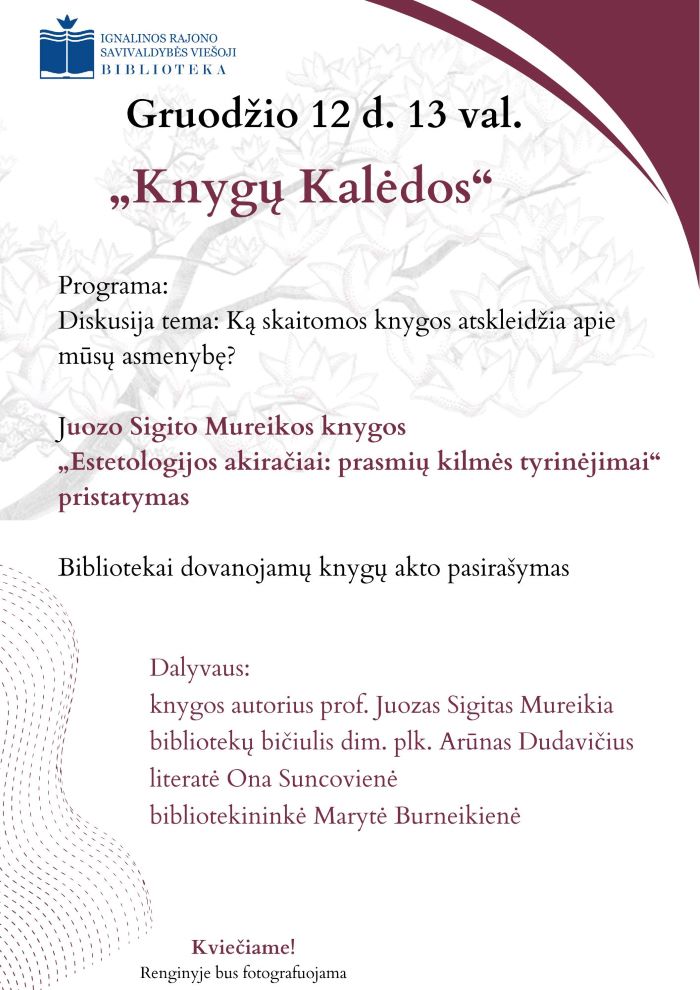 Programoje – diskusija „Ką skaitomos knygos atskleidžia apie mūsų asmenybę?“, prof. Juozo Sigito Mureikos knygos Estetologijos akiračiai: prasmių kilmės tyrinėjimai pristatymas ir bibliotekai dovanojamų knygų akto pasirašymas.