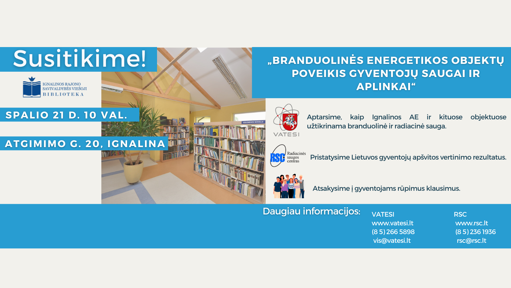 Siekdami informuoti Lietuvos gyventojus, gyvenančius netoli branduolinės energetikos objektų (Ignalinos AE ir kitų), branduolinės ir radiacinės saugos klausimais, Radiacinės saugos centras kartu su Valstybine atominės energijos saugos inspekcija 2022 m. spalio 21 d. 10 val. Ignalinos rajono savivaldybės gyventojus kviečia į susitikimą tema „Branduolinės energetikos objektų poveikis gyventojų saugai ir aplinkai“.