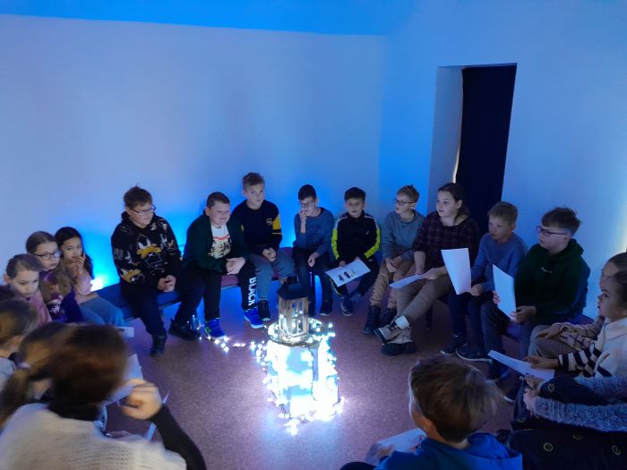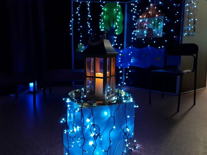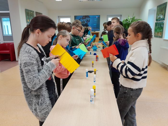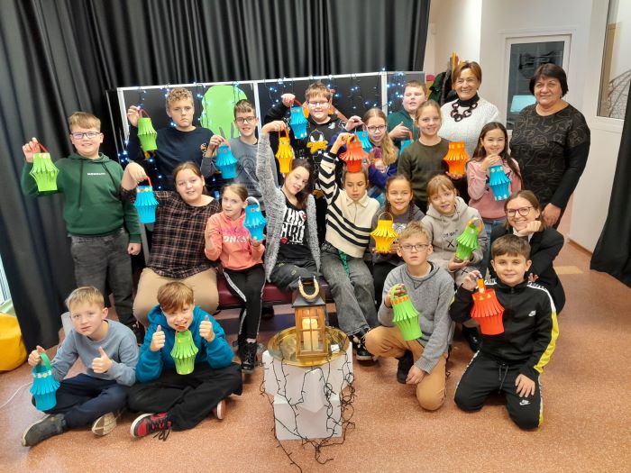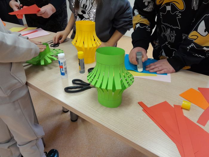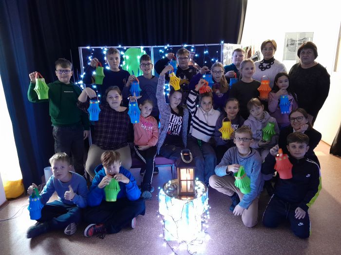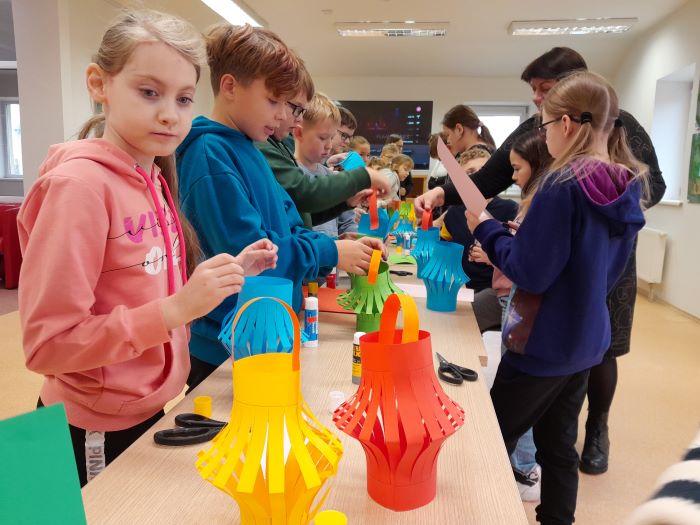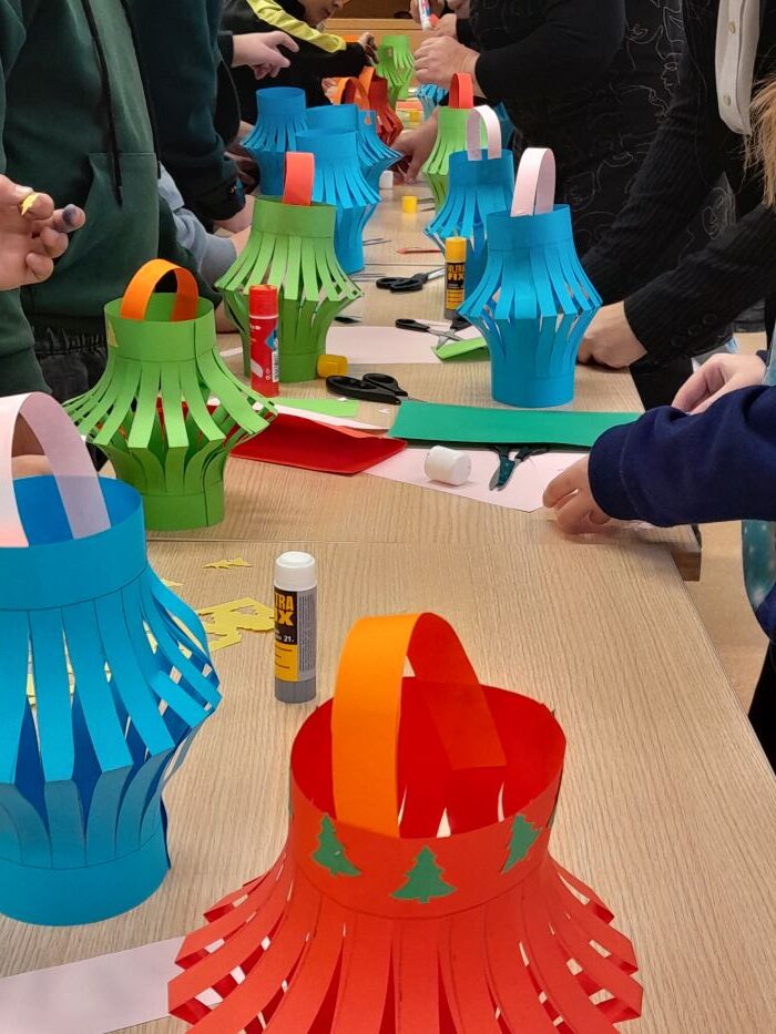 Po skaitymų ir teksto aptarimo, mokiniai gamino margaspalvius žibintus ir draugiškai nusprendė, kad pagaminę paliks juos bibliotekoje.