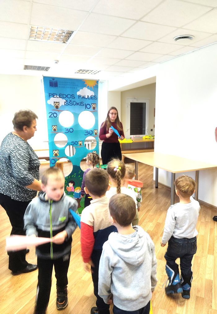 Spektaklį stebėjo Ignalinos „Šaltinėlio“ mokyklos Dūkšto skyriaus vaikai, kurie, pasisveikinę su Mįsliuku, smalsiai sekė judančius ir kalbančius veikėjus. Po vaidinimo, veiksmas persikėlė į kitą erdvę, kur vaikai dalyvavo Pelėdos Paulės iššūkyje, varžėsi dėl taikliausio metimo, žaidė ir smagiai leido laiką bibliotekoje.