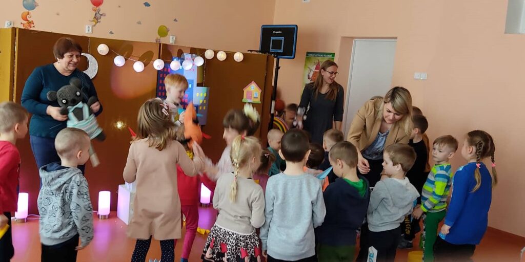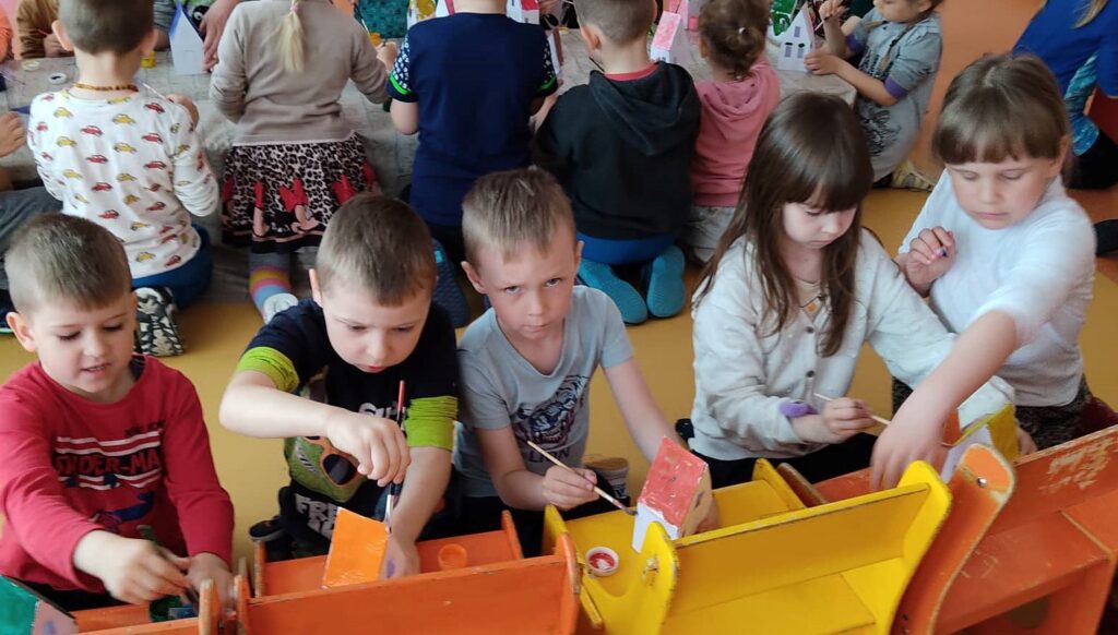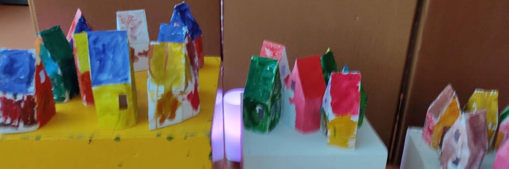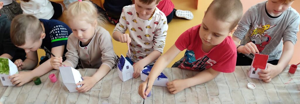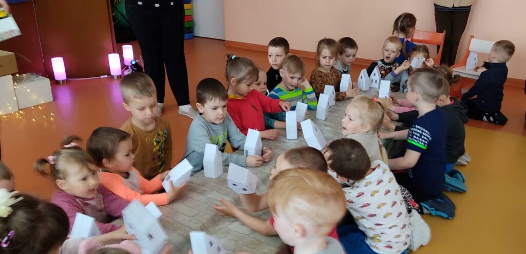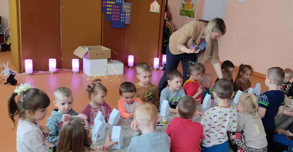 Pasibaigus spektakliukui bibliotekininkės pakvietė vaikučius į kūrybines dirbtuvėles. Čia mažieji patys spalvino iš popieriaus išlankstytus namukus, kūrė savo mažą spindintį miestą. Vėliau šoko ir žaidė nuotaikingus žaidimus.