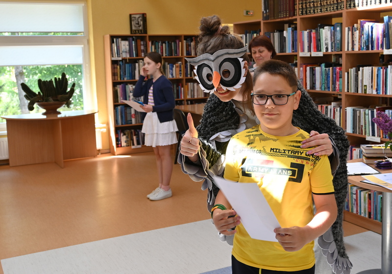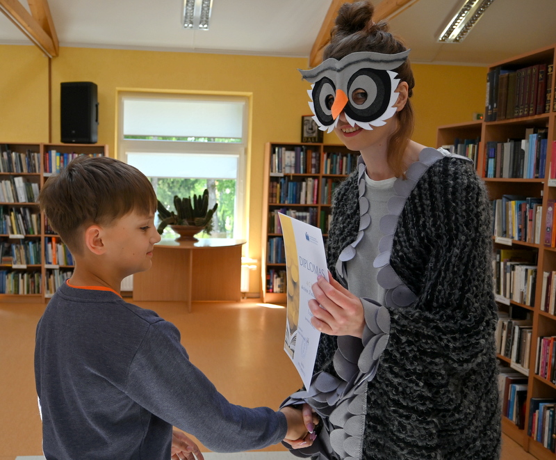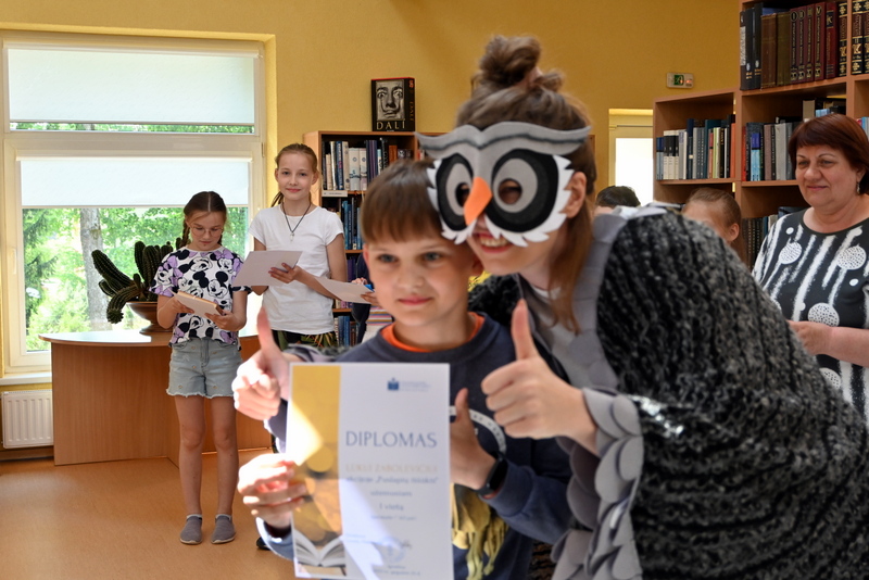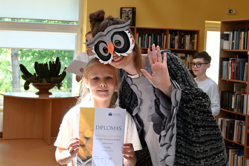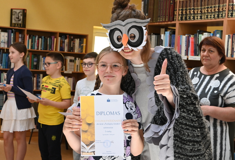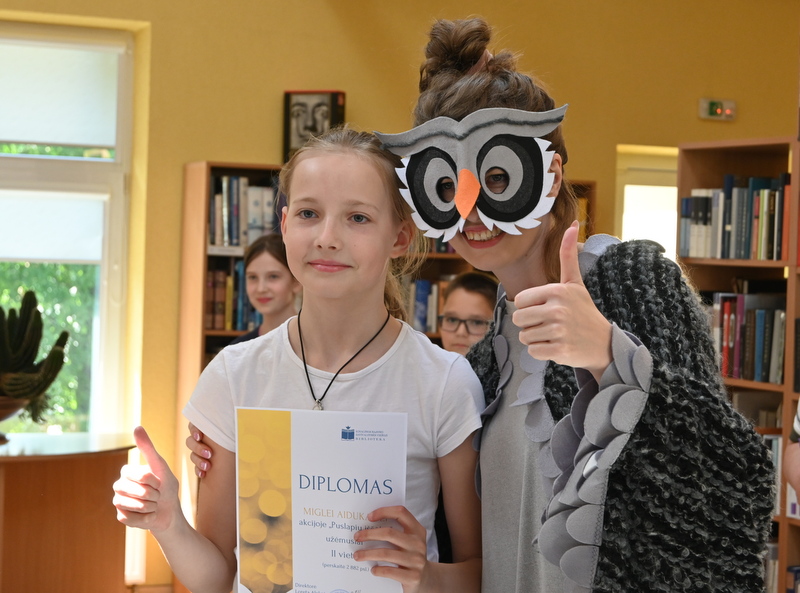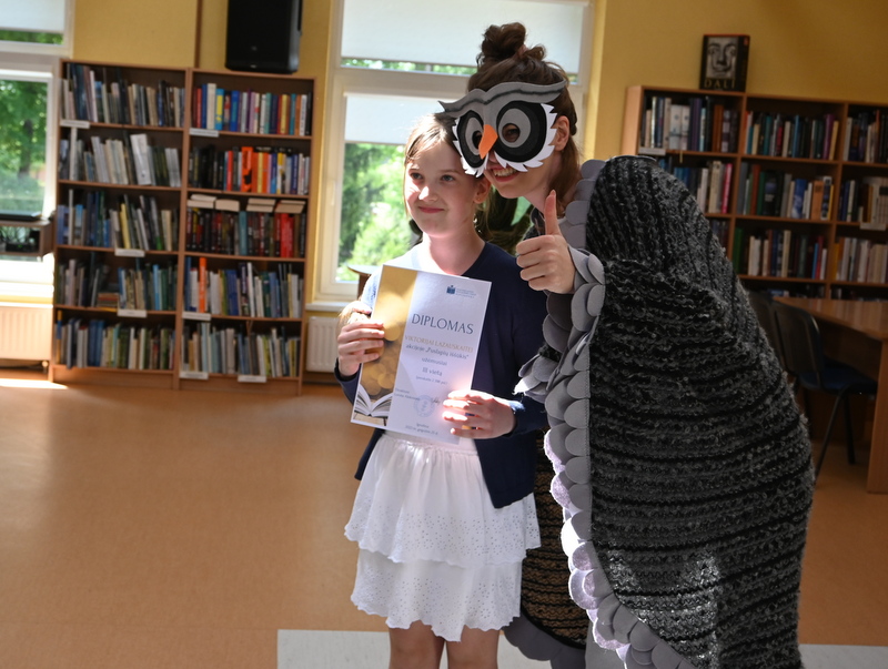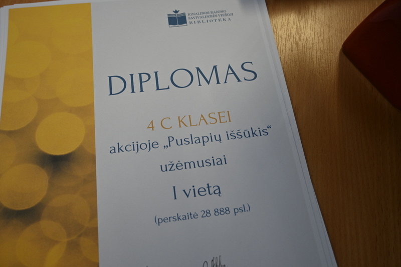 Gegužės 25 d. bibliotekoje vyko akcijos „Puslapių iššūkis“ baigiamasis renginys – apdovanojimai ir žaidimai. Pelėda Paulė džiaugėsi ir stebėjosi tokiu vaikų aktyvumu skaitant knygas. Pelėda domėjosi kokios knygos, kokie personažai vaikams patiko, ką perskaityti pasiūlytų savo geriausiems draugams vasarą. Mokiniai, žinoma, labiausiai laukė akcijos rezultatų paskelbimo. O jie buvo tokie: visos trys klasės kartu per mokslo metus perskaitė net 63 117 puslapių! Taigi, su knyga vaikai praleido tikrai nemažai nuostabių akimirkų. Pelėda Paulė pasveikino ir įteikė diplomus bei dovanas laimėtojams. Trečiąją vietą užėmė Tadas Lašinskas (4 c), Žymantas Ivanauskaas (4 b), Viktorija Lazauskaitė (4 a), antroji vieta atiteko Miglei Aidukaitei (4 c), Lėjai Martinkevičiūtei (4 b) ir Arminui Smagurauskui (4 a), pirmoji vieta – Lukui Zabolevičiui (4 c), Evelinai Patiejūnaitei (4 b), ir Medeinai Cicėnaitei (4 a). Taip pat Pelėda Paulė pasveikino ir įteikė diplomą 4 c klasei, kuri kartu perskaitė daugiausiai puslapių, net 28 888. Saldus prizas mokinių laukė mokykloje.