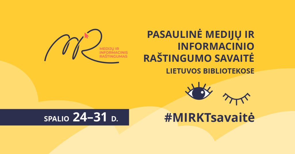 Ar knieti spausti nuorodą, viliojančią laimėti milijoną? Ar mokate tikrinti faktus ir šaltinius? Ar žinote, kaip išvengti trolių fabriko taikiklio? Tokių žinių savo lankytojams gali suteikti Lietuvos bibliotekos, tampančios medijų ir informacinio raštingumo kompetencijų (MIRKT) centrais. Spalio 24–31 dienomis, kai visame pasaulyje minima Pasaulinė medijų ir informacinio raštingumo savaitė, Lietuvos bibliotekos kviečia visuomenę į gausius renginius įvairiomis medijų raštingumo temomis. Vyks nemokamos paskaitos, susitikimai, mokymai, žaidimai.