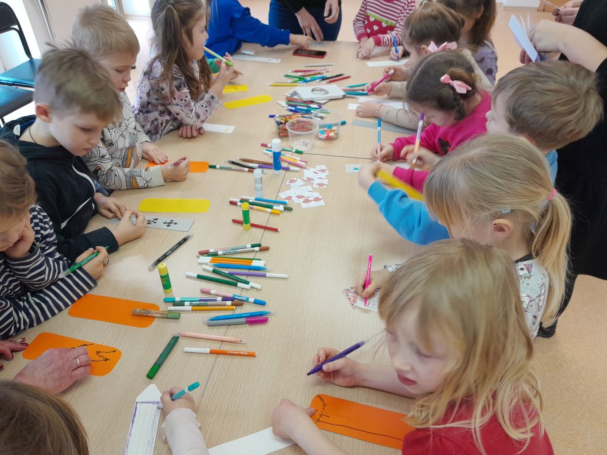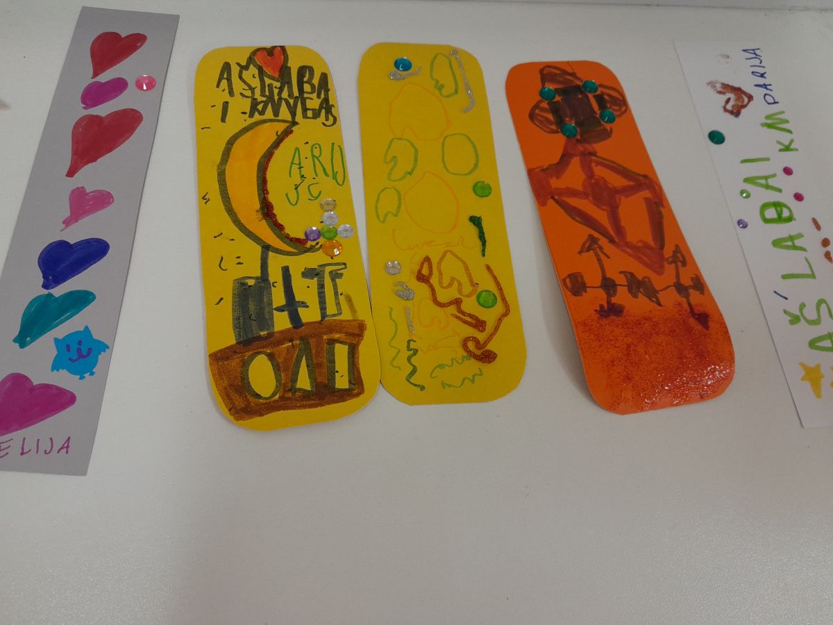 Po pasakojimo ir knygos aptarimo vaikų laukė kūrybinė užduotis – dekoruoti iš popieriaus pagamintus knygų skirtukus. Juos vėliau galės panaudoti skaitydami knygeles.