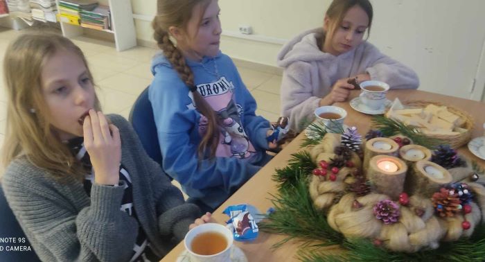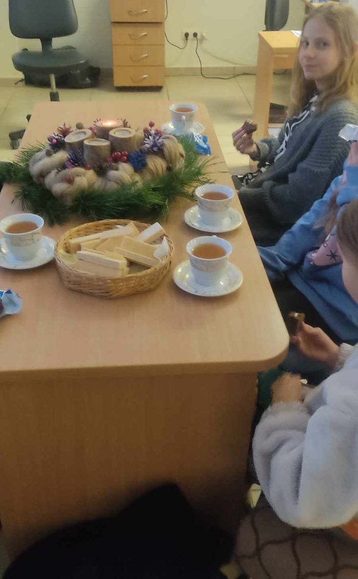 Bibliotekininkė Dalė vaikams papasakojo apie senovinius Advento papročius ir tradicijas, pavaišino gardžia imbierine arbata bei sausainiais. Jaunieji literatai dalijosi savo mintimis ir svajonėmis laukdami gražiausių metų švenčių – Šv. Kalėdų.