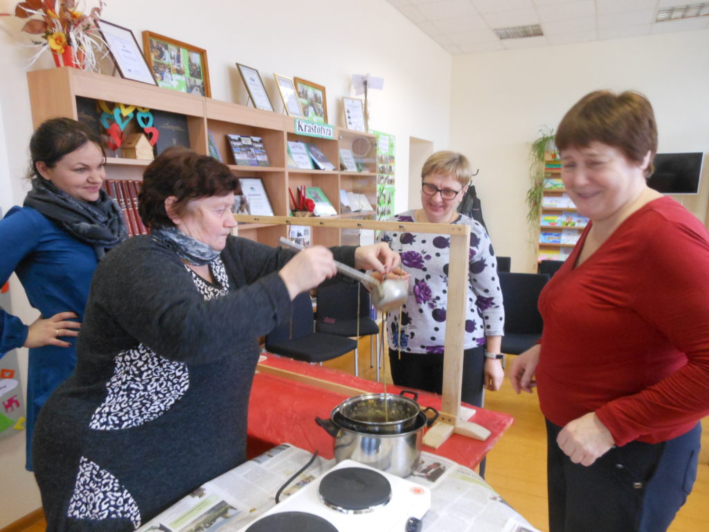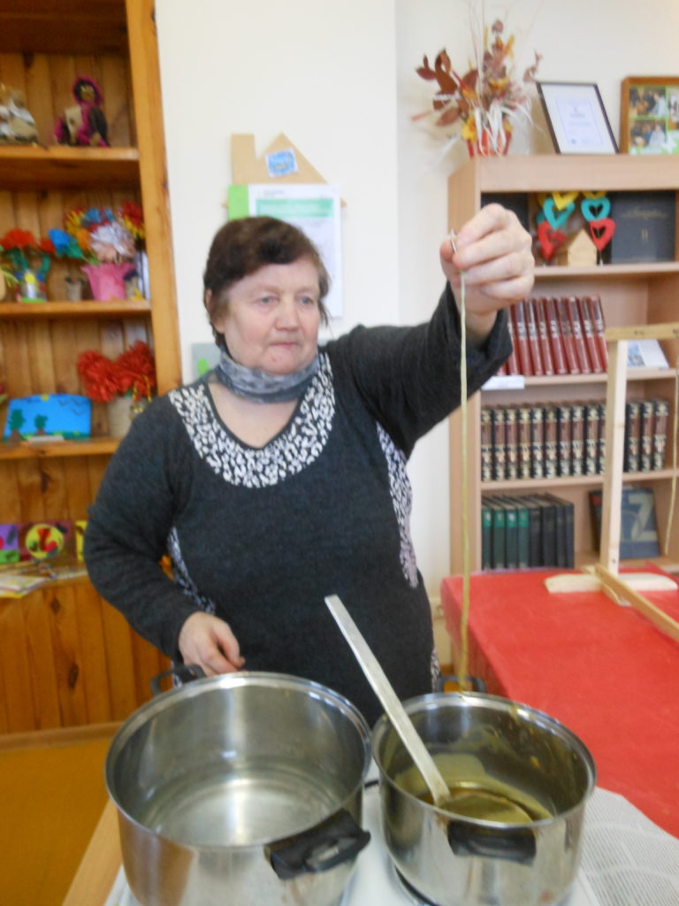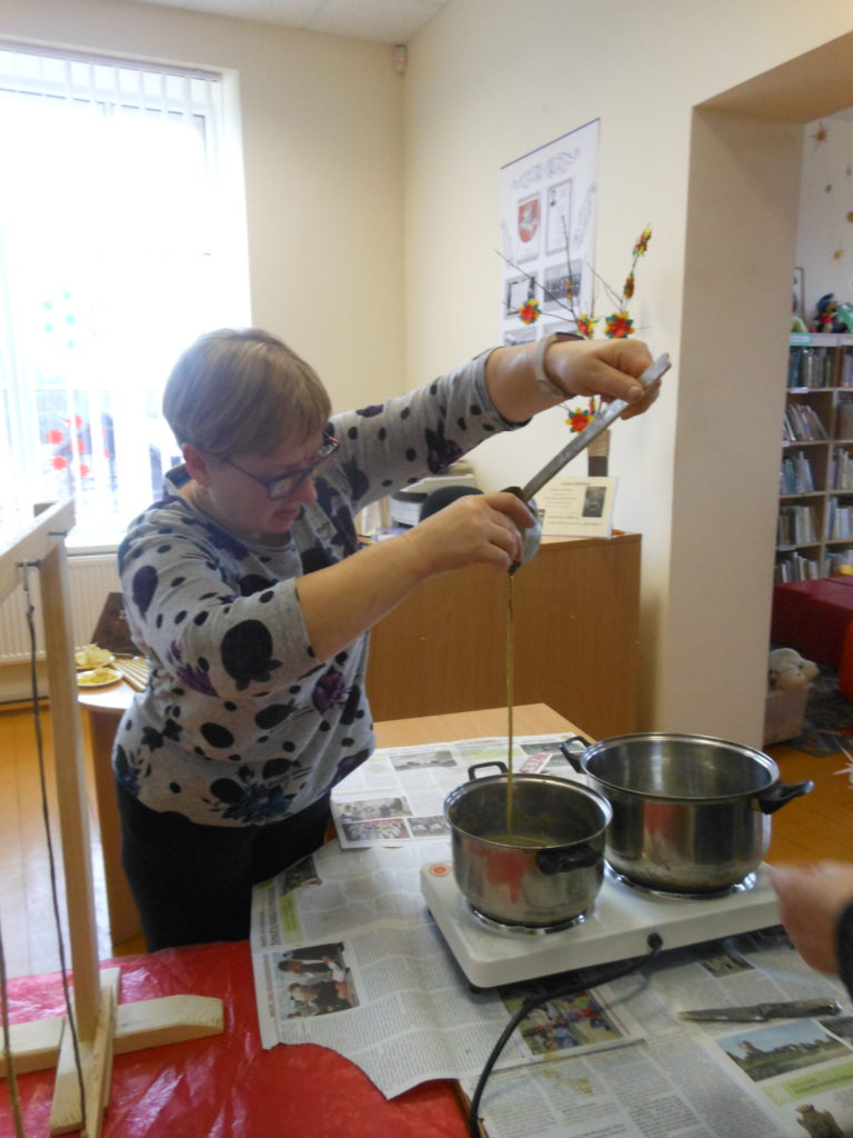 Edukacinį užsiėmimą, skirtą nykstančiam senajam tradicinių žvakių liejimui vedė šio amato puoselėtoja Laima Mikalkienė iš Šileikiškės kaimo. Šio amato Laima išmoko iš vyro senelių. Ji su šeima augina bites ir iš senų korių lieja vaškines žvakes.