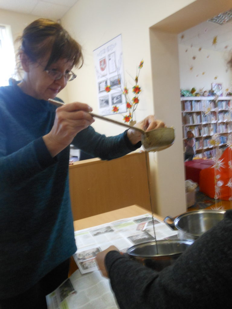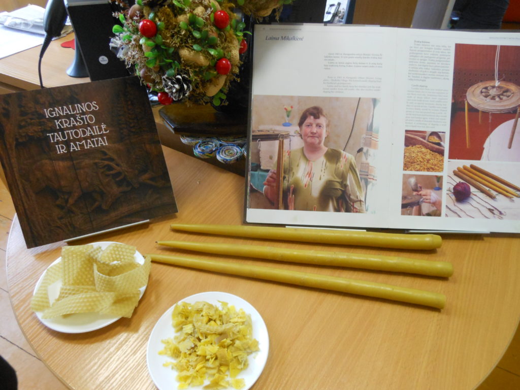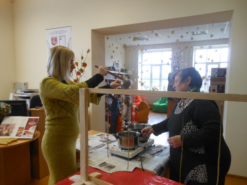 Laima mielai sutiko išsamiai paaiškinti ir parodyti, iš ko ir kaip liejamos žvakės. Į užsiėmimą tautodailininkė atsivežė visas priemones. Mažieji užsiėmimo dalyviai į puodą trupino vaško juosteles, vaškavo lininį siūlą, kabino į specialų stovelį. Suaugusieji ant jų pylė sušildytą vašką, formavo žvakes. Netrukus pasirodė bendro darbo vaisius – nuostabiai kvepiančio geltono vaško žvakės. Užsiėmimo dalyviai turėjo progą įsitikinti, kad natūralaus vaško kvapas, žvakės liepsna ir iš jos sklindanti šiluma nuramina ir atpalaiduoja. Tuo galės dar ne vieną kartą įsitikinti visi tie, kurie dovanų gavo po geltono vaško žvakę.