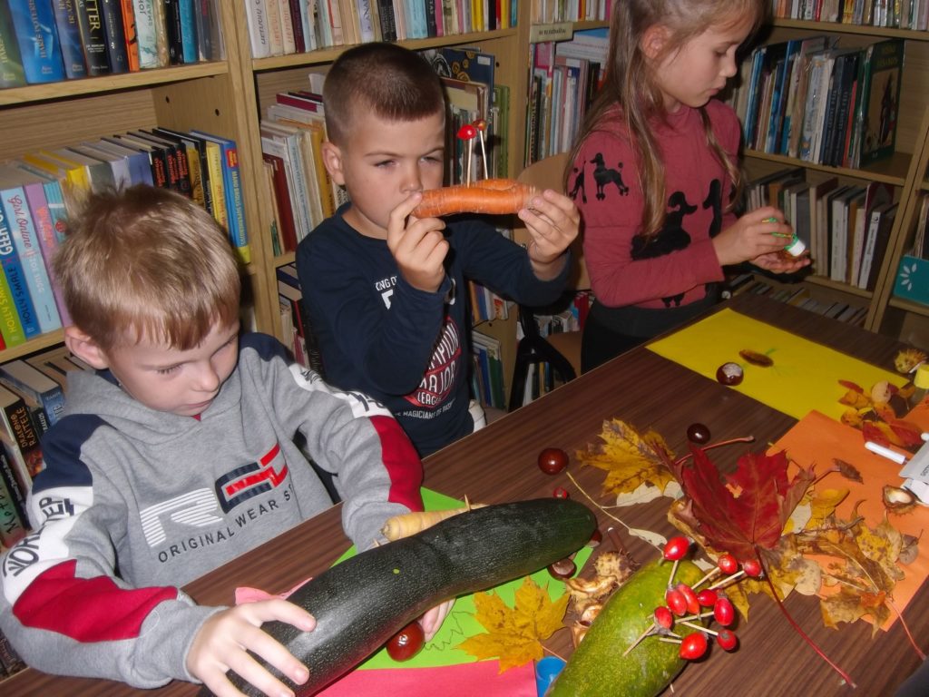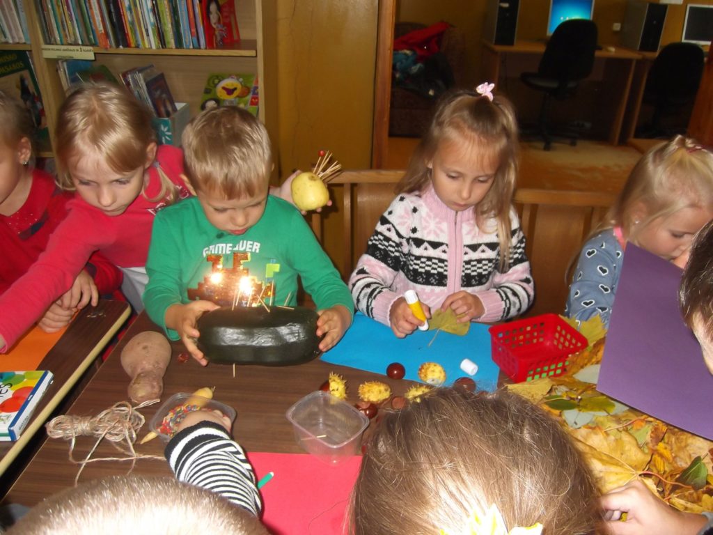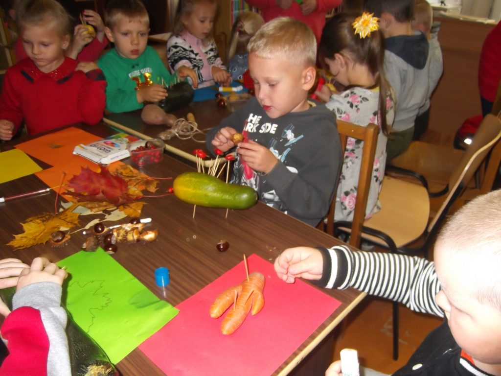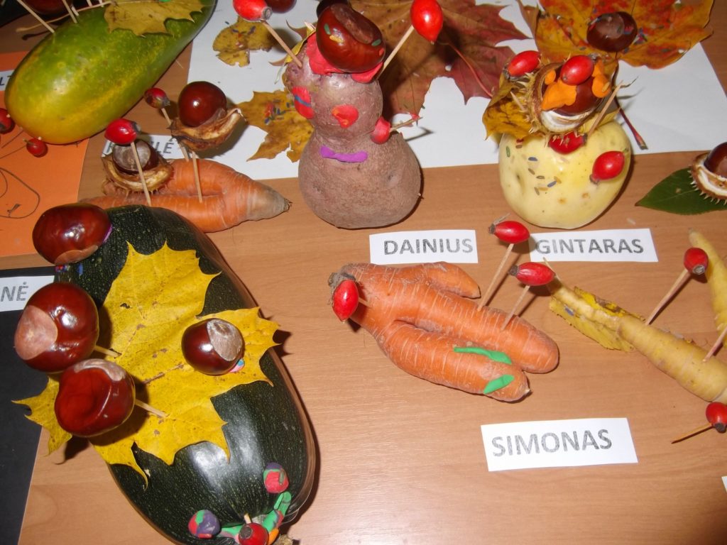 Kiekvienas vaikas yra kūrybingas ir noriai rudens gėrybes panaudoja savo darbeliuose. Kai tik jiems buvo pasiųlyta tema, vaikų rankutėse kiekviena daržovė pavirto netikėtu, nuostabiu darbeliu: viščiuku, avele, ežiuku, pasakos arba mėgstamo filmuko veikėju. Edukacinės valandėlės metu vaikai iš plastilino ir kaštonų, morkų, obuolių, cukinijos ir kitų rudeniškų gėrybių lipdė savo mėgstamą personažą. Vėliau sugalvojo jiems vardus.