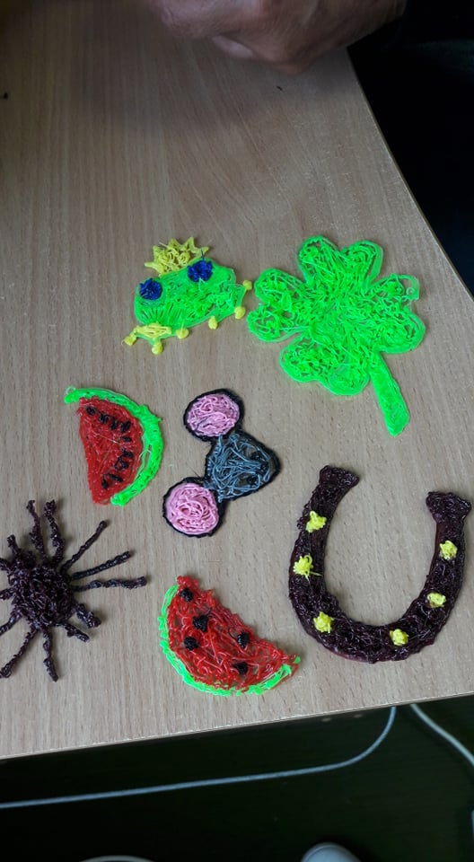 Vaikai, smagiai šurmuliuodami, rinkosi piešti gėlytes, varlytes, voriukus ir ėmė išmaniuosius pieštukus į rankas. Vieniems sekėsi geriau, kitiems pradžia buvo sunkesnė. Virginija kiekvienam aiškino kaip įdėti vielutes, kaip jungti visus taškus piešinėlyje. Ir vaikams pirmoji pažintis su 3D pieštukais patiko. Džiugu, kad kartu su vaikais piešė ir močiutė. Susitarėme, kad kitą kartą piešti 3D pieštukais Virginija mokys močiutes. O vaikai džiaugėsi savo pasigamintais darbeliais ir jau žinojo ką norės gauti dovanų