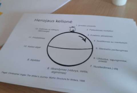 Dirbtuvių metu dalyviai aiškinosi pasakojimo struktūrą, kuri egzistuoja jau nuo Aristotelio laikų, kalbėjosi apie kūrinio herojų, jo kelionę per 12 žingsnių (kelionės centre yra personažas), pagal Christopher Vogler knygą „The Writer‘s Journey: mythic Structure for Writers“.