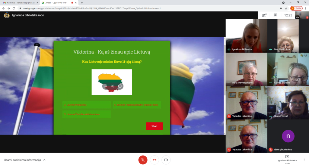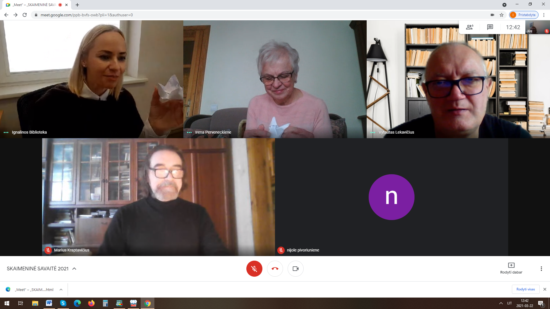 Kovo 25 d. grupė ignaliniečių dalyvavo dar viename virtualiame susitikime, skirtame skaitmeninei savaitei. 10.40 val. jungėsi prie viktorinos „Ką žinau apie internetą“, o nuo 11 val. – prie tiesioginės transliacijos „Kaip (iš) gyventi tarp ekranų?“ su Rasa Jauniškiene ir Renata Gaudinskaite. Pranešėjos kalbėjo, apie tai, kaip internetas padeda bendrauti, dirbti, bet tuo pačiu turi ir neigiamų padarinių mūsų sveikatai. Sužinojo, kaip planuoti laisvalaikį internete. O susitikimas baigėsi šiltu pokalbiu, popierinės lelijos lankstymo pamokėle. Lankytojų pašymu, kartojome ir klausimus apie Lietuvą.