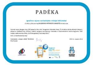 Ignalinos rajono savivaldybės viešajai bibliotekai – padėka už aktyvų dalyvavimą SAUGESNIO INTERNETO SAVAITĖS iniciatyvoje 2022-03-03