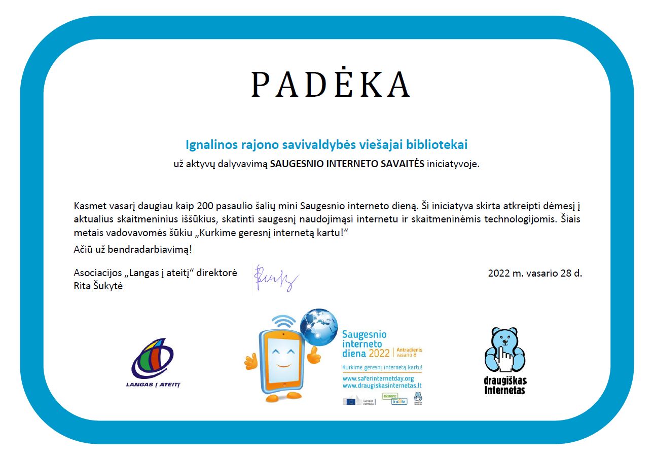 Ignalinos rajono savivaldybės viešajai bibliotekai – padėka už aktyvų dalyvavimą SAUGESNIO INTERNETO SAVAITĖS iniciatyvoje