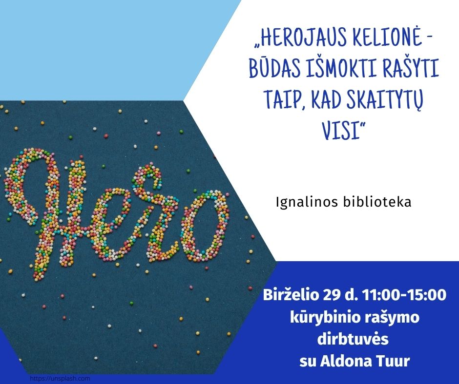 Birželio 29 d. 11 val. kūrybinio rašymo dirbtuvės su kūrybinio rašymo lektore, Kauno technologijos universiteto dėstytoja, publicistikos ir grožinės literatūros kūrėja Aldona Tuur „Herojaus kelionė – būdas išmokti rašyti taip, kad skaitytų visi“. Projektas „Pasakoja tekstai“.