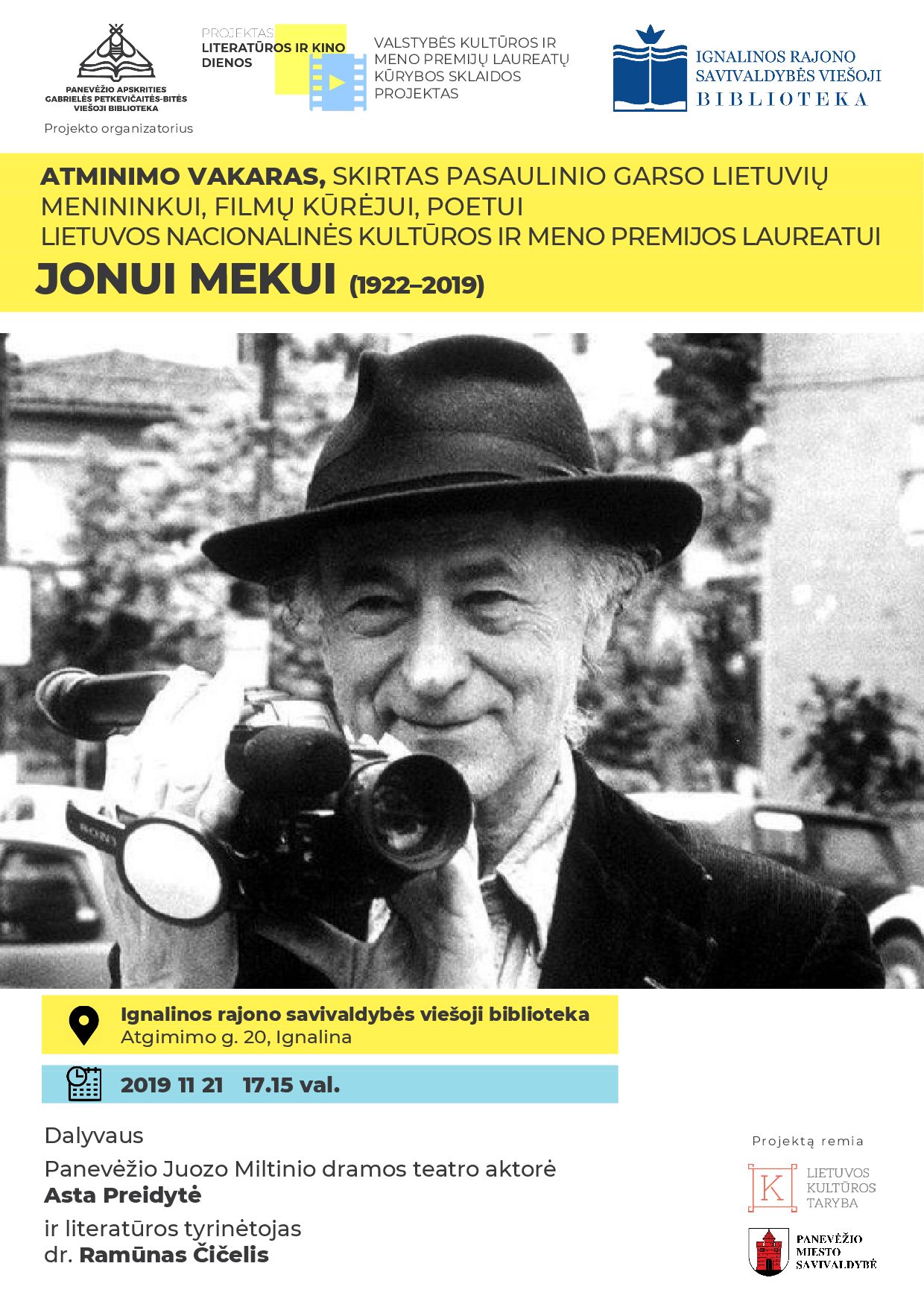 Lapkričio 21 d. 17.15 val, Informacijos ir kraštotyros skaitykloje Nacionalinės kultūros ir meno premijos laureato Jono Meko atminimo vakaras. J. Meko eilėraščius ir laiškus skaitys aktorė Asta Preidytė. J. Meko asmenybę ir kūrybą pristatys literatūros tyrinėtojas, eseistas dr. Ramūnas Čičelis.