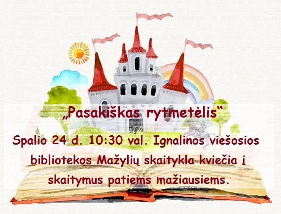 Spalio 24 d. 10.30 val. mažylių skaitykla kviečia į skaitymus „Pasakiškas rytmetėlis“. Tai pasakų skaitymai vaikams nuo 3 iki 5 metų.