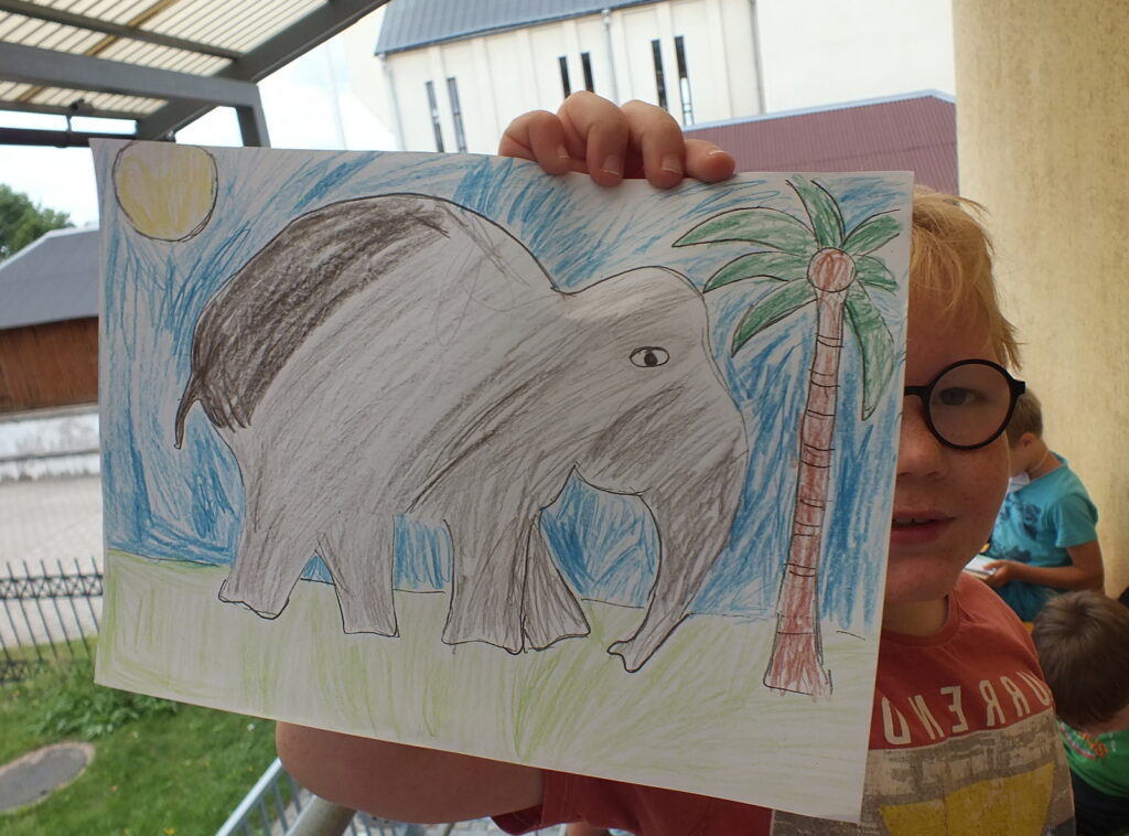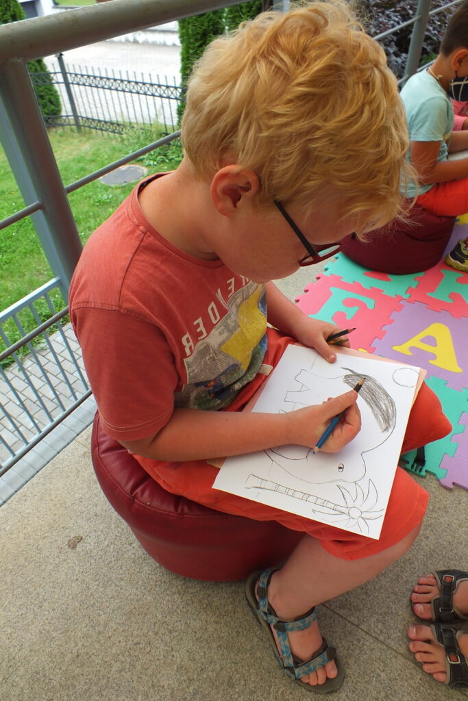 Rugpjūčio 12 dieną vaikai susirinko į vasaros garsinius skaitymus Ignalinos viešosios bibliotekos kiemelyje. Buvo skaitoma Jean de Brunhoff Skaitė knygelė „Dramblio Babaro nuotykiai“. Šioje knygoje net kelios istorijos apie geriausią dramblį pasaulyje. Vaikai skaitė pirmąją, kurioje pasakojama kaip drambliukas pateko į miestą, kaip pats išsirinko sau kostiumą, skrybėlę, batus, tapo karaliumi ir patyrė daug nuotykių. Perskaitę smagią istoriją mažieji kūrė piešinį-dėlionę: spalvino, karpė, dėliojo… Greičiausiai sudėlioti pavyko Kamilei ir jos sesutei Jurgilei. Gal todėl, kad dviese? 🙂