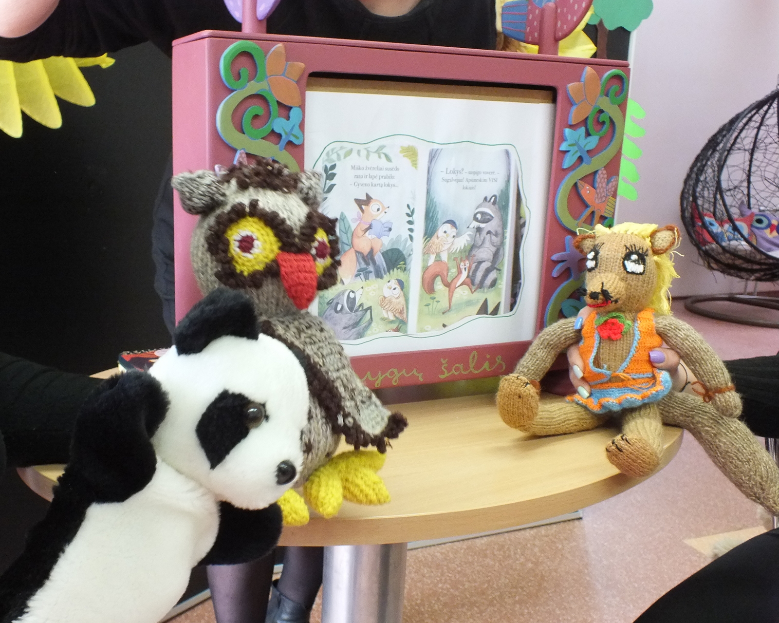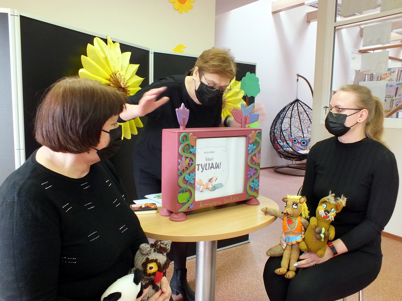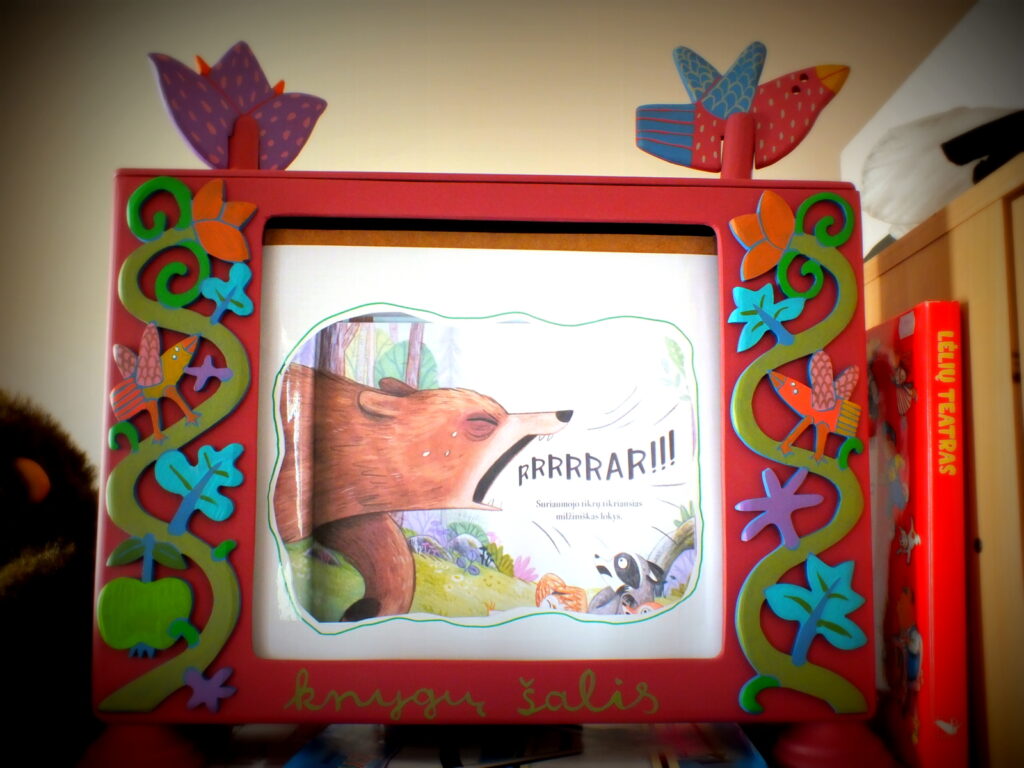 Vaikučius pradžiugino kitoks N. Kinnear knygelės „Šššš! Tyliau“ skaitymas. Knygelės iliustracijos buvo rodomos miriorama. Kas tai? Tai – tai specialioje dėžėje rankenėle sukama panorama, tarsi senoviško televizoriaus prototipas. Mirioramos lange vienas po kito keitėsi paveikslėliai gražiai papildydami bibliotekininkės Aldonos skaitomą pasaką, o bibliotekininkių Rūtos ir Erikos valdomos lėlytės lapė, meškėnas, voverė, pelėda ir meška dar labiau pagyvino šią istoriją.