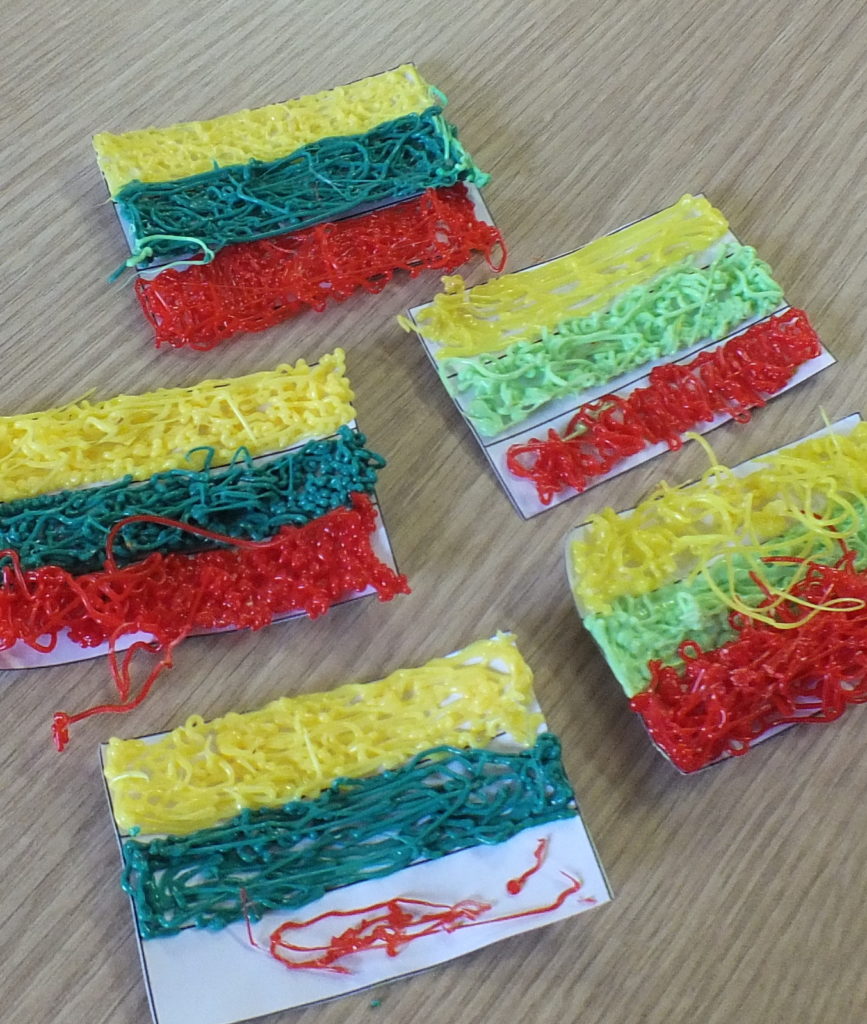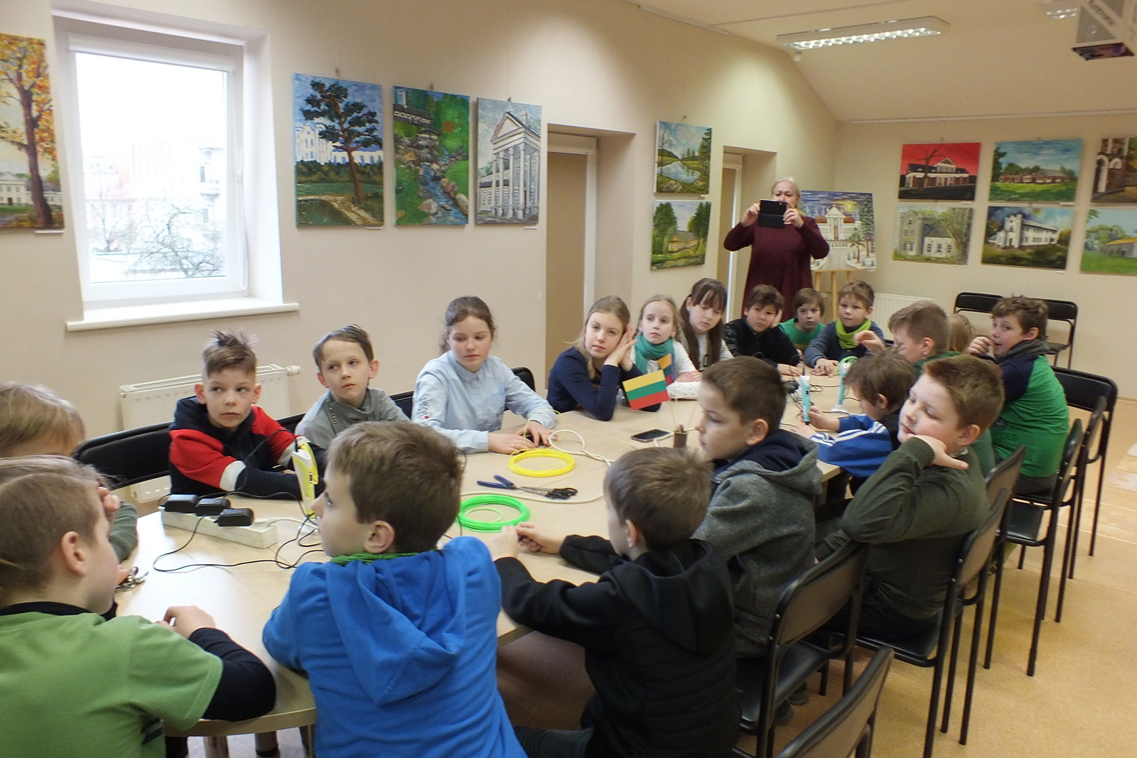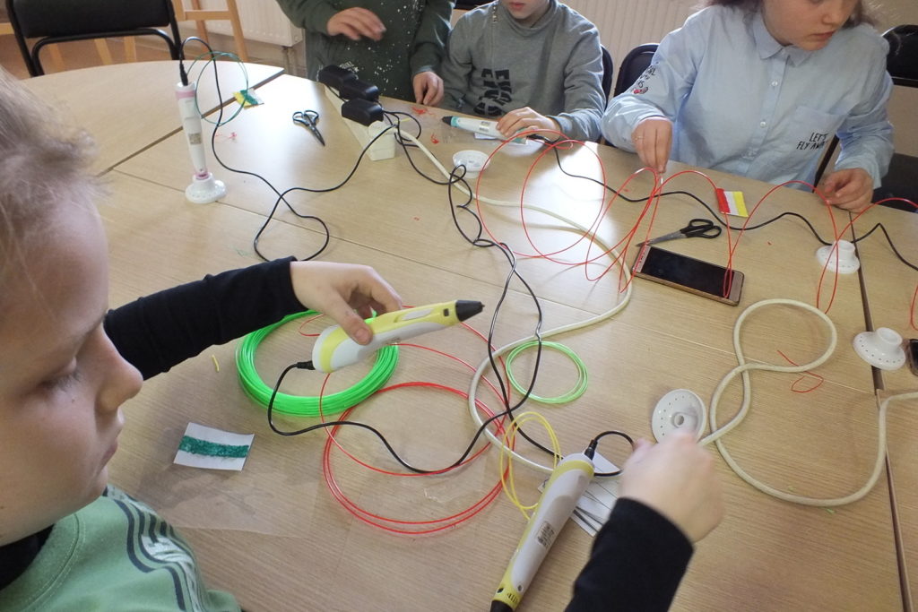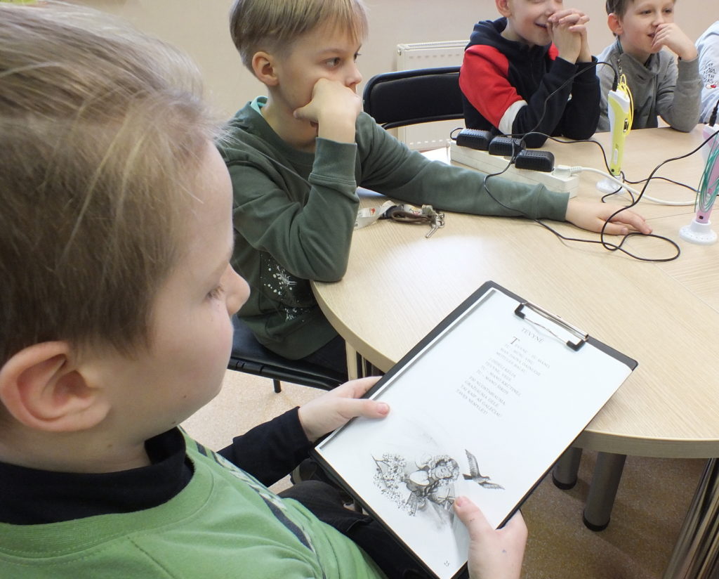 susipažino su 3D pieštukais ir juos išbandė – piešė trispalves vėliavėles. Aplankė