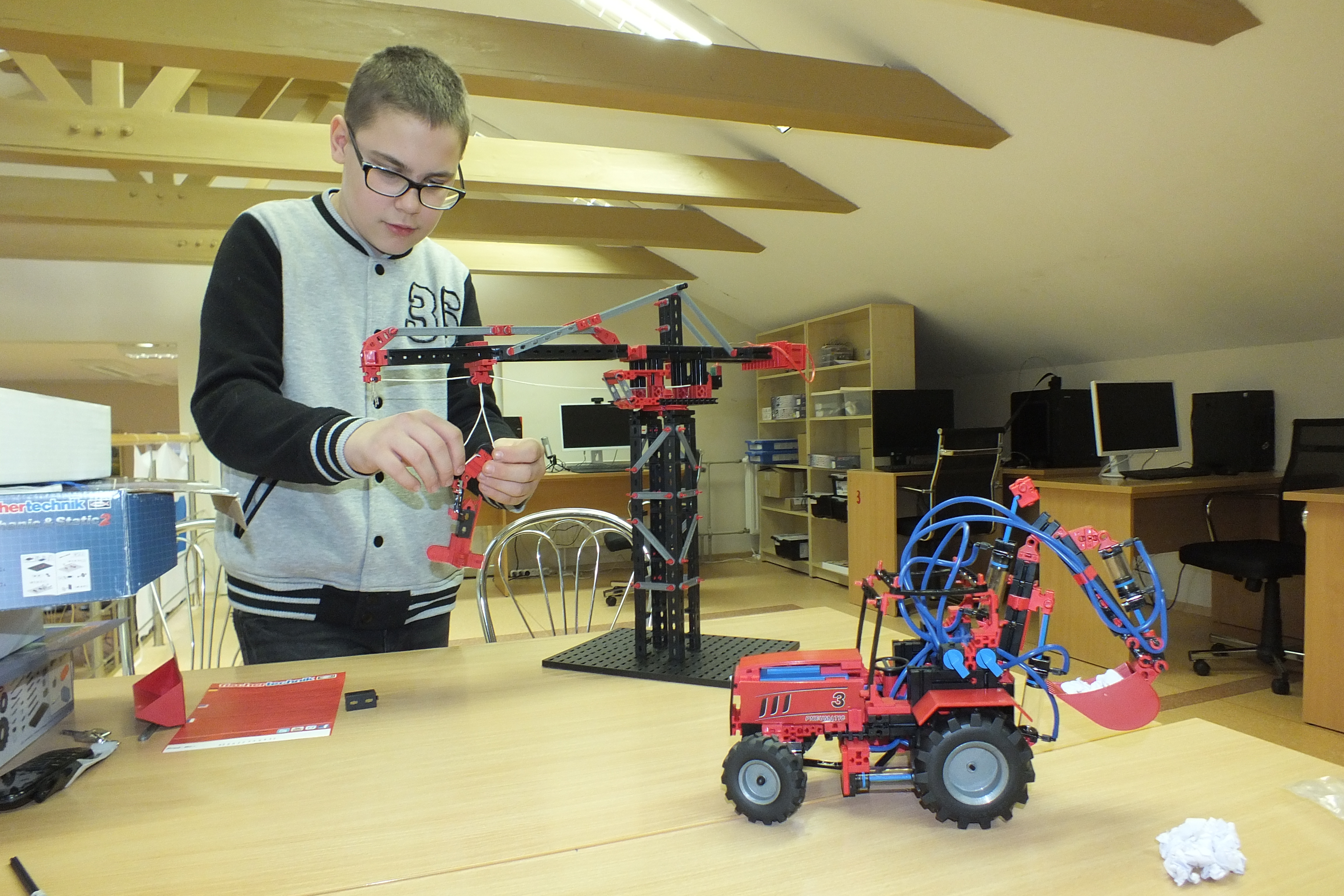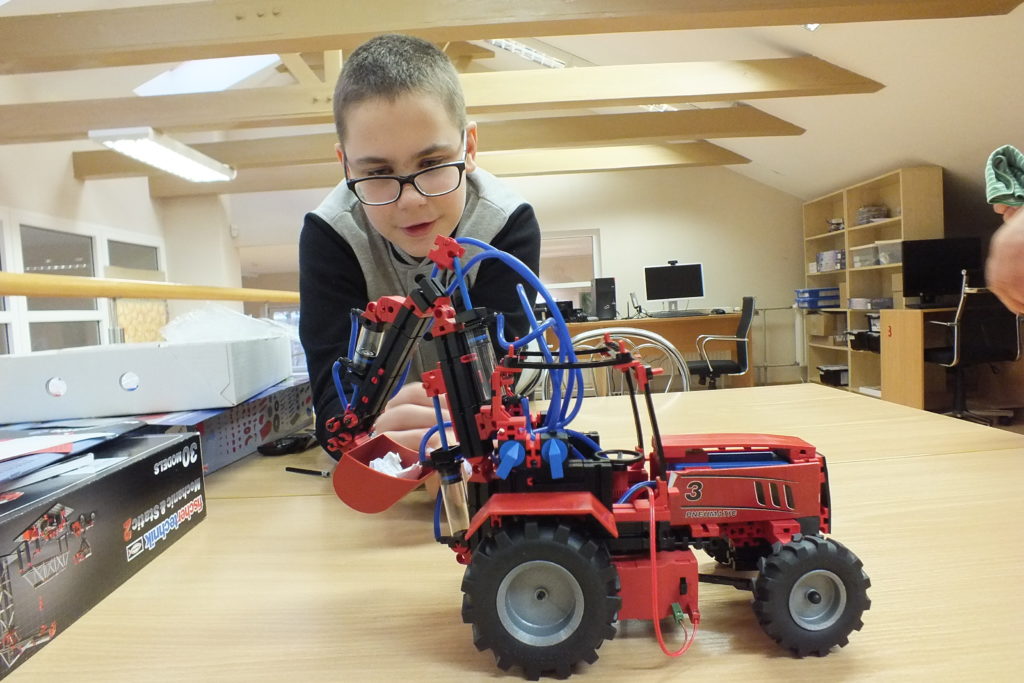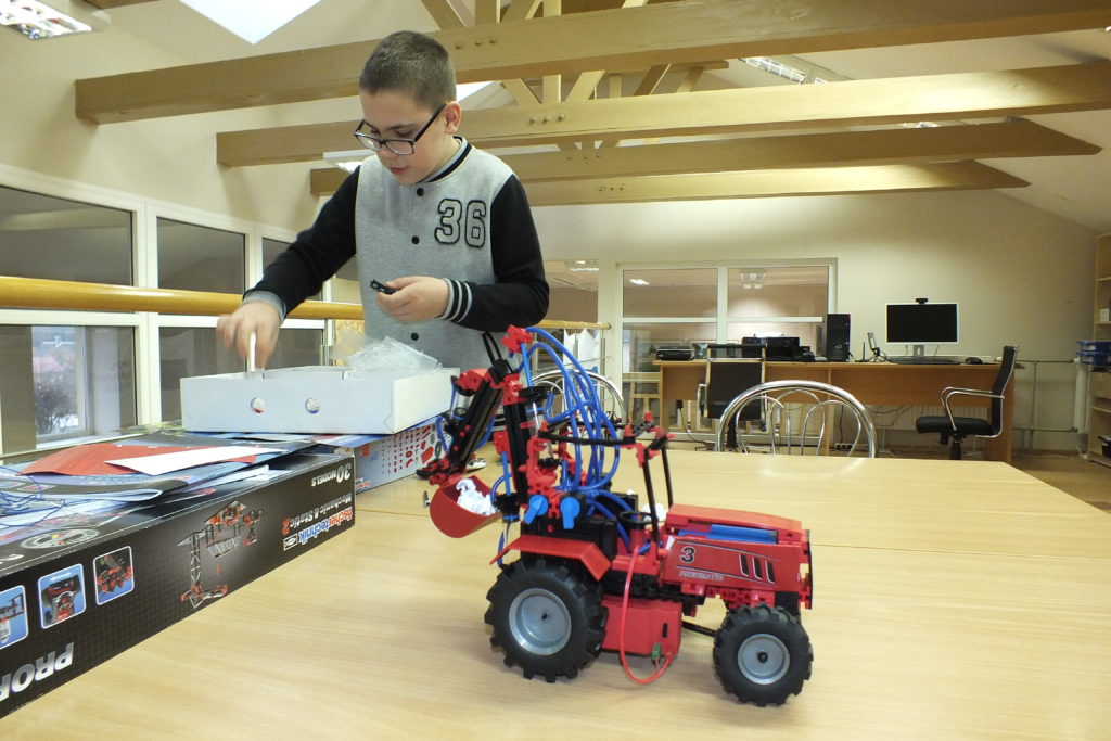 Ignas dažnai užsuka į Atradimų erdvę. Labiausiai čia jį traukia „Fischertechnik“ konstruktoriai. Vaikinas jau sukonstravo kraną ir ekskavatorių.