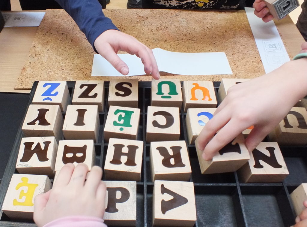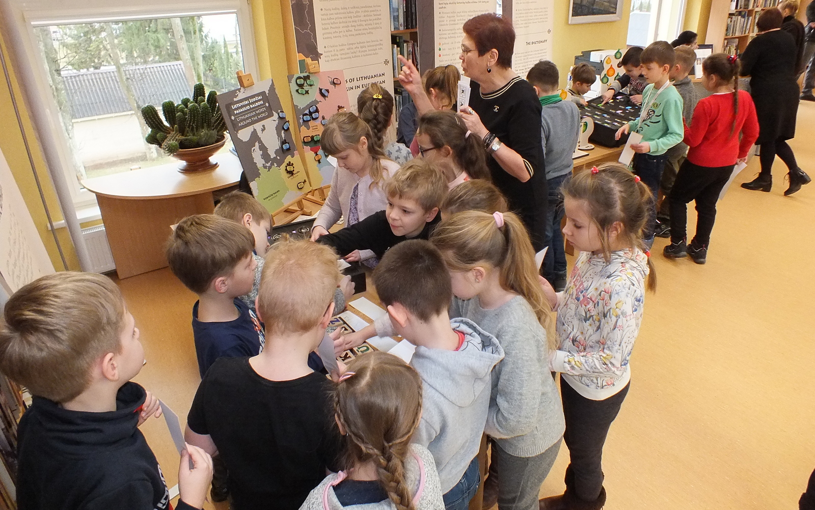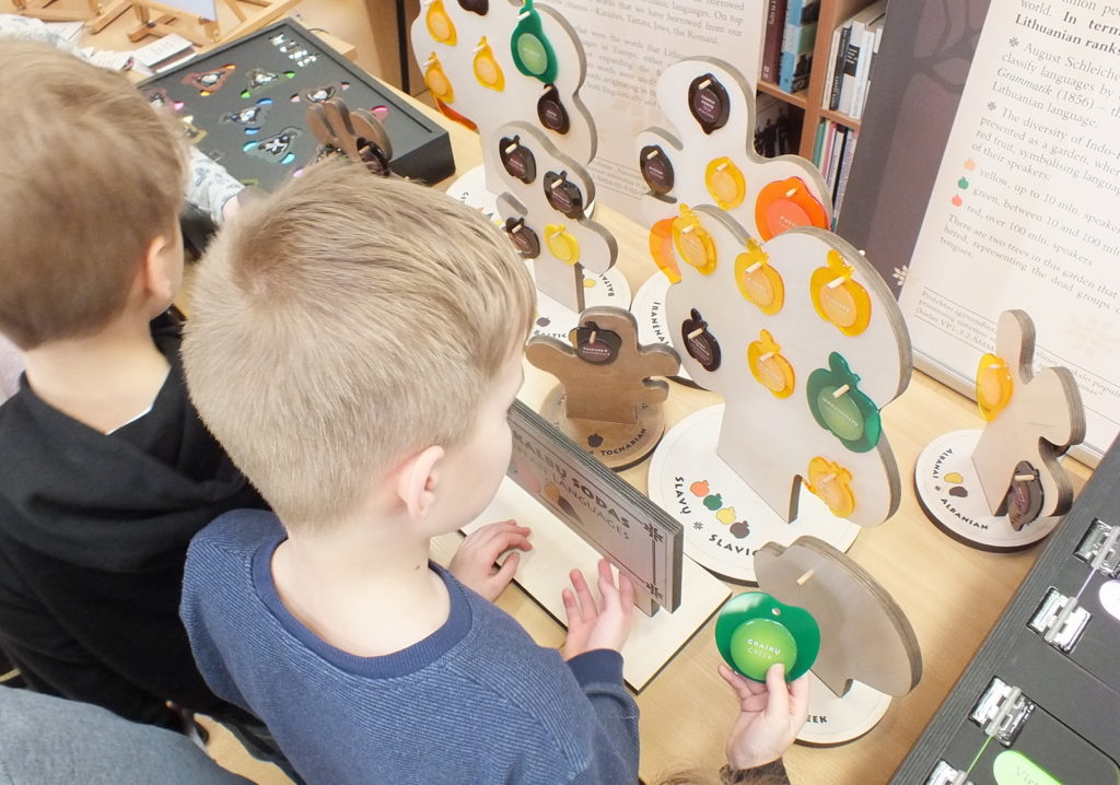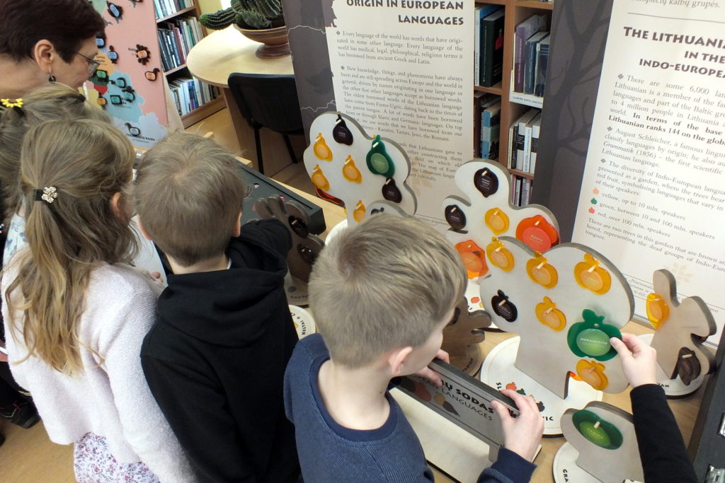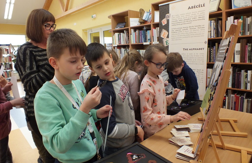 Dar jaunieji bibliotekos lankytojai  susipažino su bibliotekoje eksponuojama edukacine paroda „Paliesk lietuvių kalbą rankomis“. Įdomiausia Vaikams buvo spaudais su lietuviškomis raidėmis sudėlioti savo vardus.
