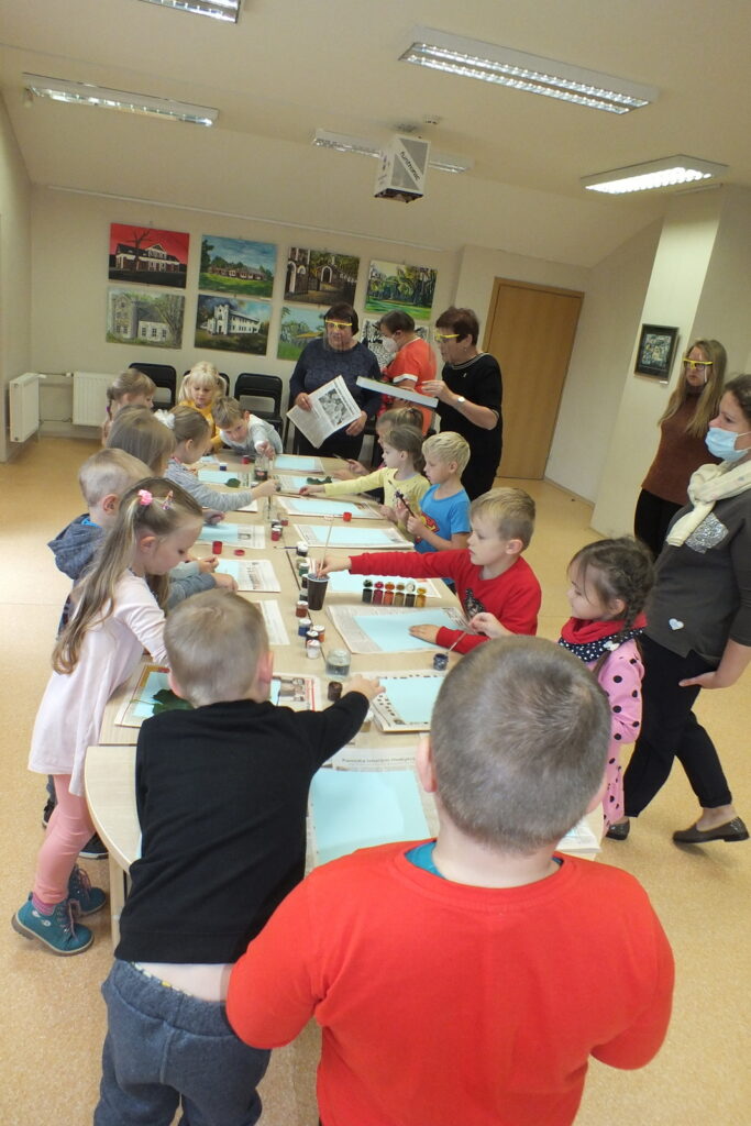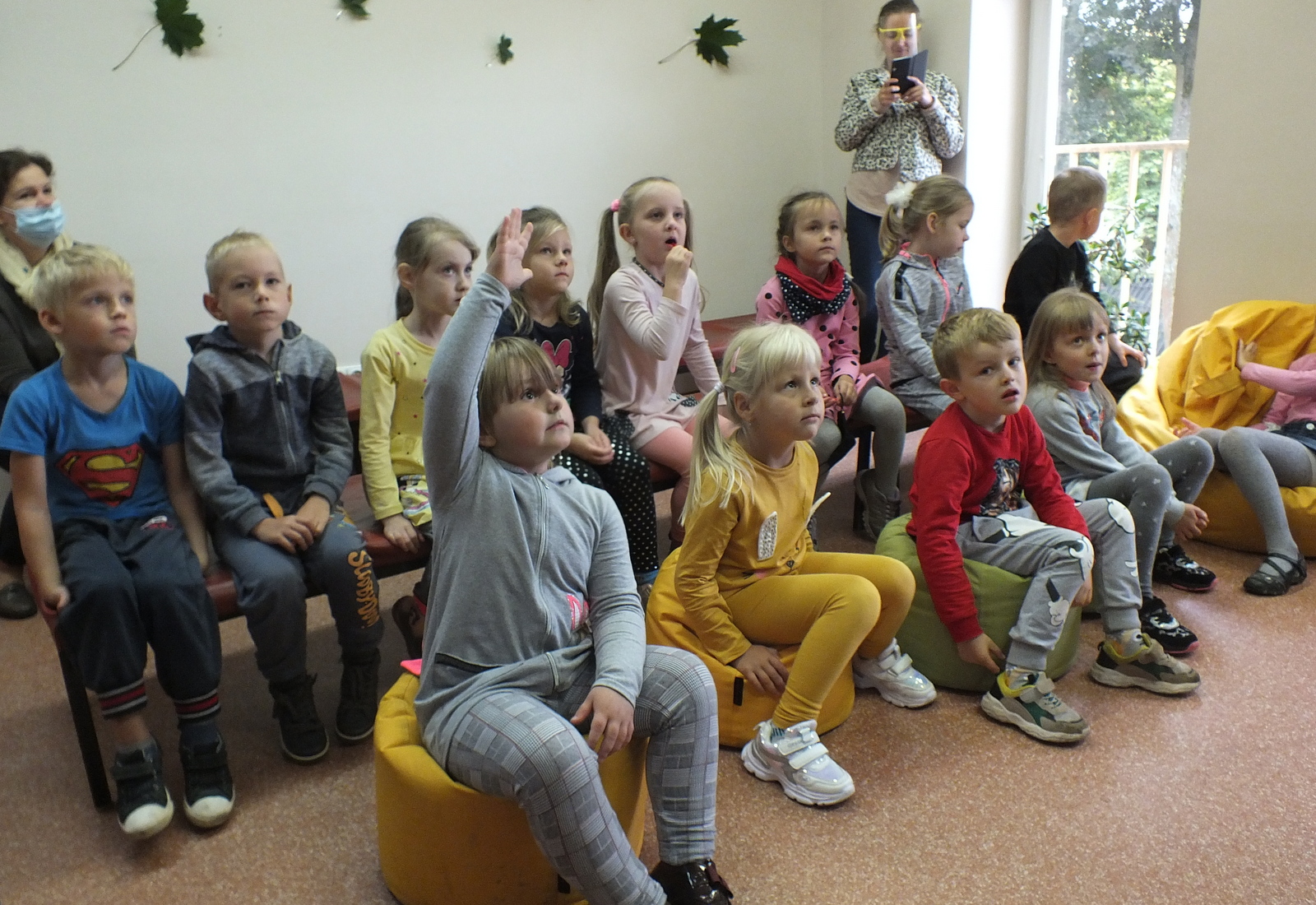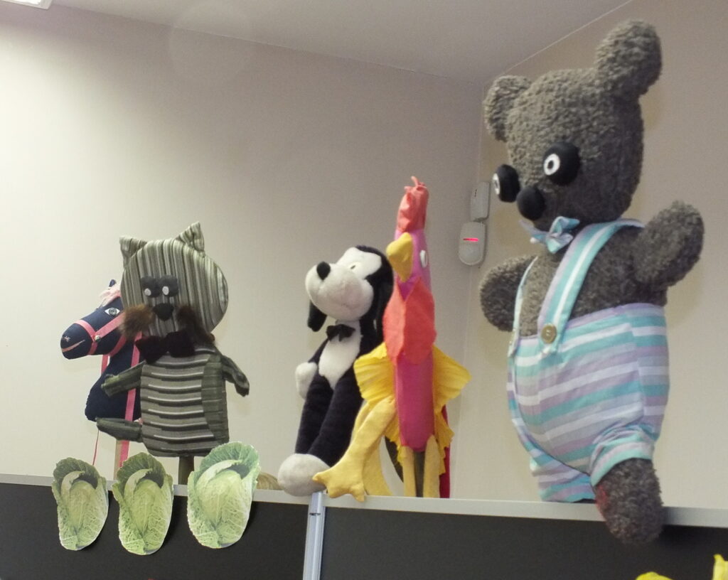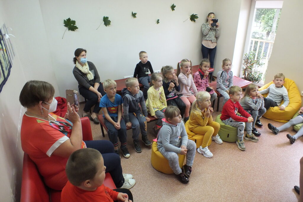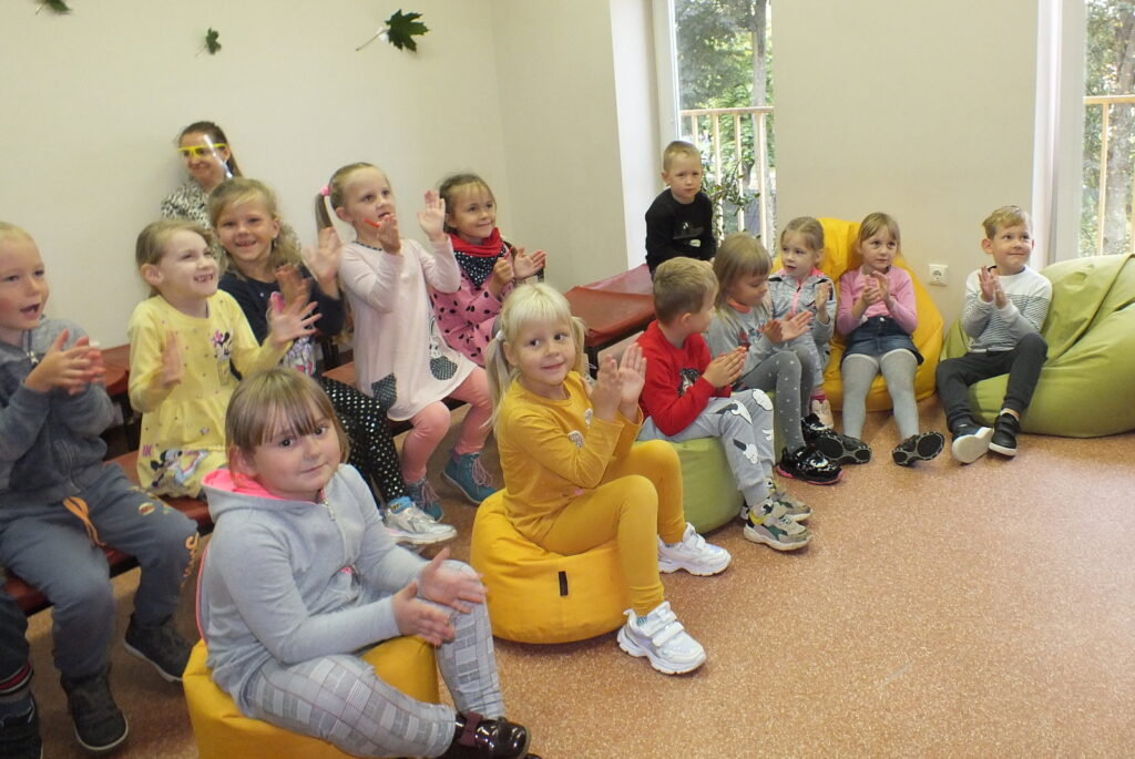 Vieną sykį katinas išėjo iš namų pasipeliauti. Landžiojo, landžiojo po kopūstų daržą, tik plept jam ant uodegos galo kopūsto lapas ir užkrito. Persigandęs Katinas pamanė: „Dabar tai jau tikrai dangus griūva!“ Ir pasileido bėgti… Ar tikrai dangus gali užgriūti vaikai sužinojo pažiūrėję pasakėlę. Vėliau visų laukė kūrybinė valandėlė, mažieji sukūrė dailius paveikslėlius piešdami medžių lapais,  išbandė Interaktyvias grindis, tiesiog žaidė smagius žaidimus. Turiningai ir smagiai pasibuvę bibliotekoje išskubėjo atgal į mokyklėlę.
